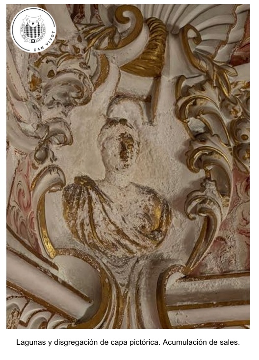 Una parte de los frescos de Can Vivot ha sido gravemente afectada por problemas de humedad, acumulados a lo largo de los años debido a filtraciones de agua y a la concentración de sales en las capas inferiores. Esto ha provocado grietas, desprendimientos y disgregación de las capas de mortero y pintura, generando un riesgo de pérdida irreversible si no se interviene. La superficie del tejado que requiere intervención es de 60,5 m², y la superficie de frescos deteriorados a restaurar es de aproximadamente 40 m², repartidos entre las distintas zonas afectadas.