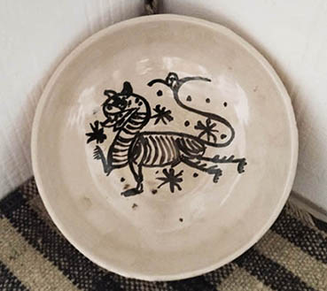 A partir de 250 euros de donación, podrás llevarte una escudilla de cerámica a torno vidriada en blanco y manganeso. Presenta escena de león rampante sobre fondo estrellado.