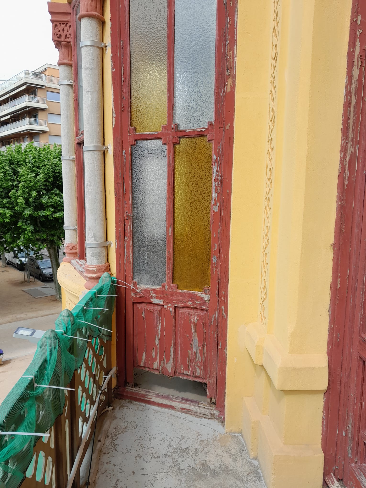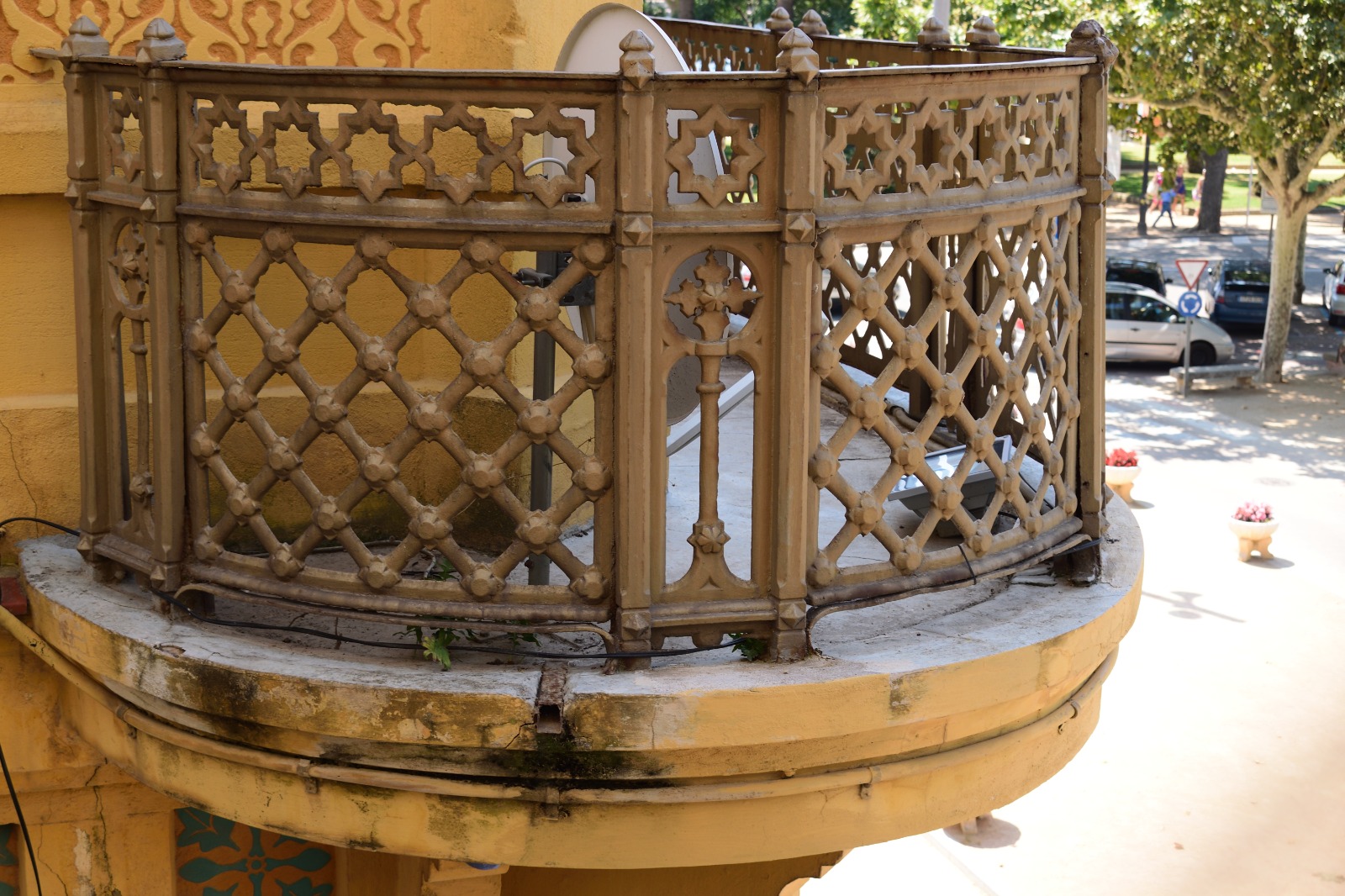 El estudio del estado de la fachada ha revelado un deterioro importante en los esgrafiados modernistas del primer piso, así como en los paramentos de la planta baja, donde se han detectado numerosas reparaciones mal realizadas causadas por la exposición continua a la humedad. Se recomienda decaparlo todo y rehacerlo de nuevo. El balcón presenta numerosas grietas que con los años ha provocado la filtración del agua de la lluvia, la oxidación de las bigas metálicas que sostienen la losa y la rotura de las ménsulas que hay debajo. La recomendación es repicar la losa, sanear los elementos estructurales, reforzar, rehacer volúmenes, impermeabilizar el pavimento y retirar todas las ménsulas agrietadas para sustiruirlas por copias exactas. Por otro lado, será necesario reponer todos aquellos elementos originales del edificio que con el paso de los años han ido desapareciendo, como unas caras grotescas que existían debajo de los balcones, el remate de la tripe cúpula o las celosías de los ventanales de la planta baja.